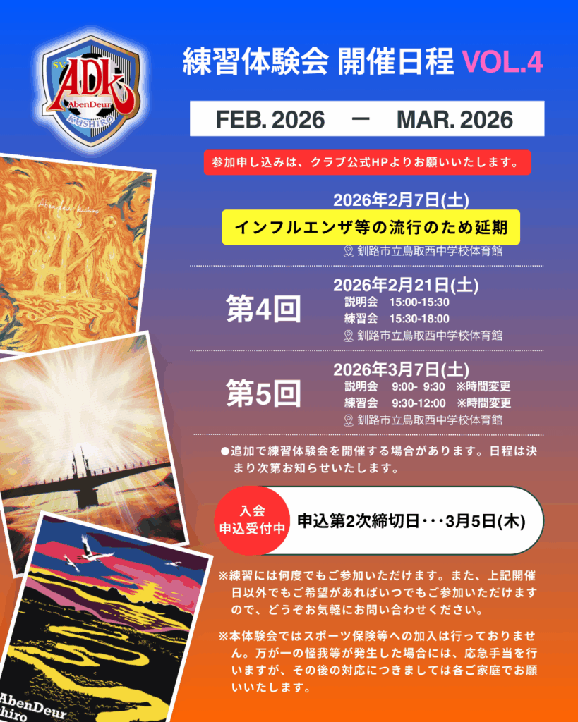 2月7日(土)に予定しておりました第4回練習体験会ですが、現在、インフルエンザ等の感染症が地域で流行している状況を受け、参加者の皆さまの安全を最優先に考え、2月21日(土)へ延期 することといたしました。