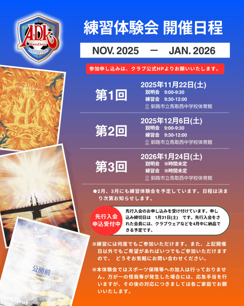 2026年度の新入会員募集ポスター公開前ですが、練習体験会を実施します。参加申し込みにつきましては、「体験・入会について」のページの問い合わせフォームよりお願いいたします。